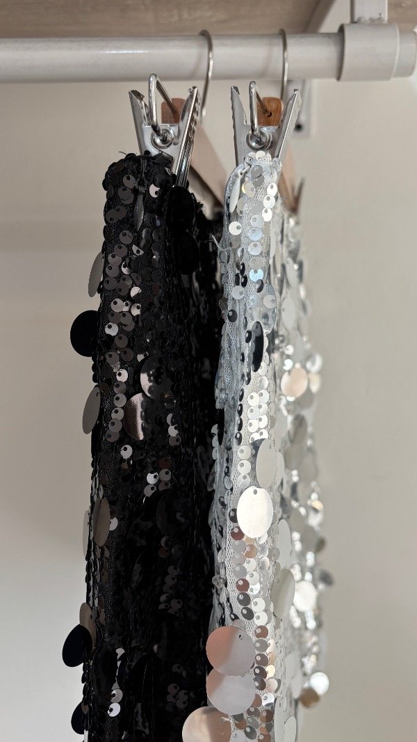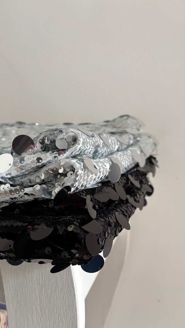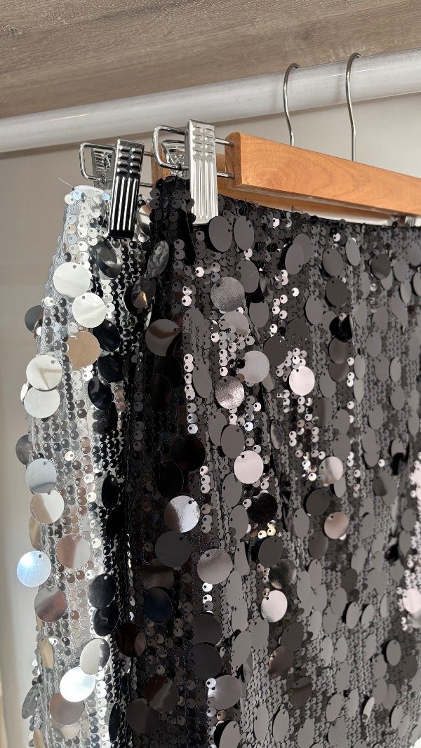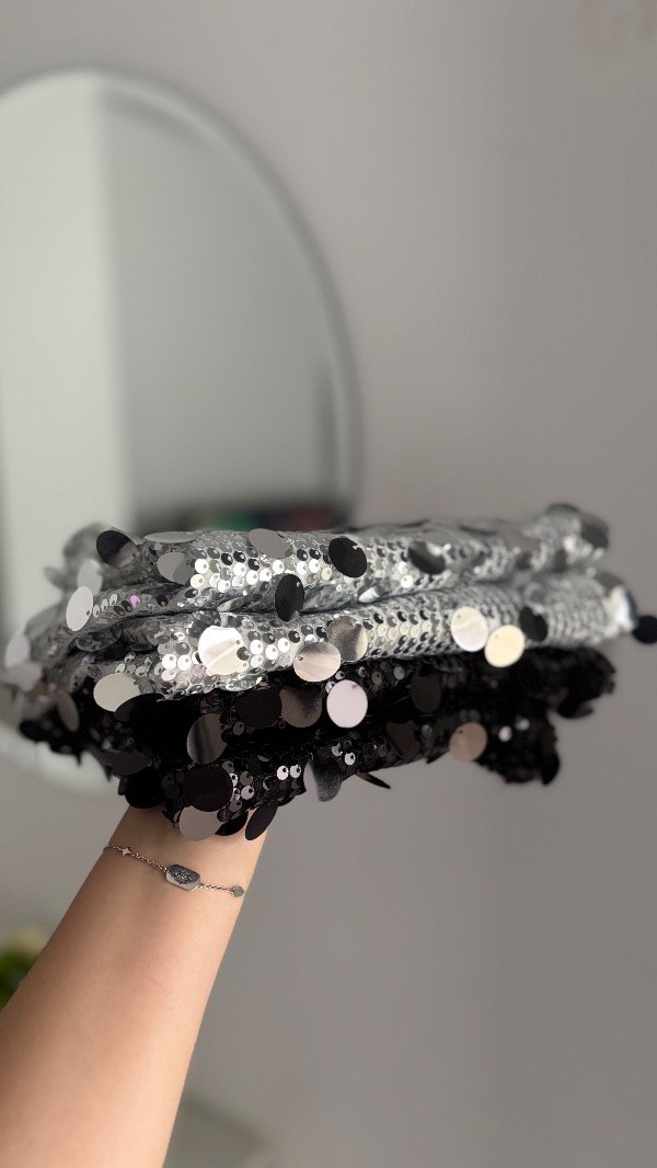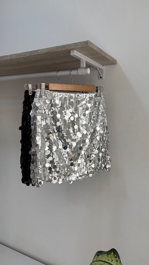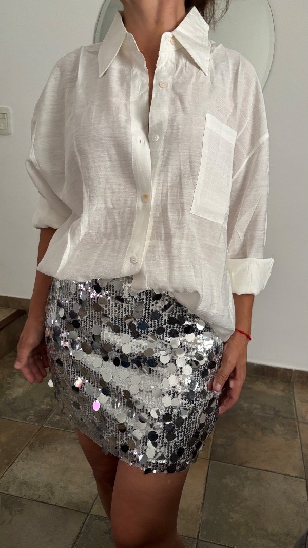 Descripción : falda corta confeccionada en tela elastizada microtul de lentejuelas & forro interno, cierre al costado & pinzad detrás
