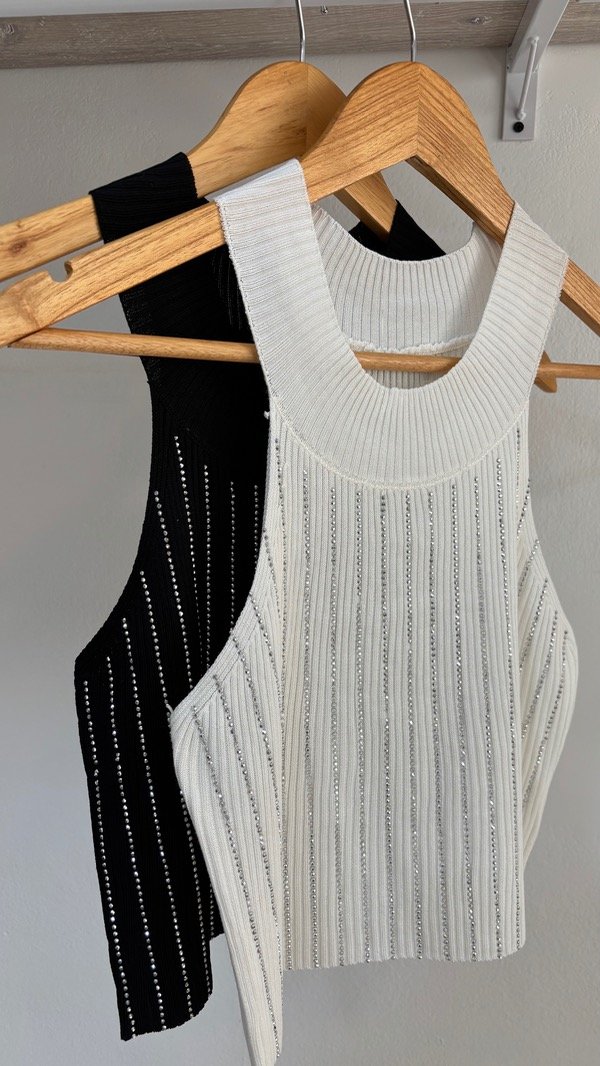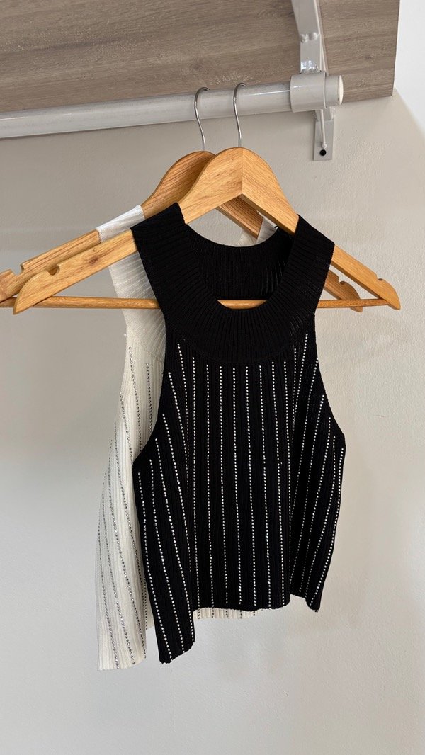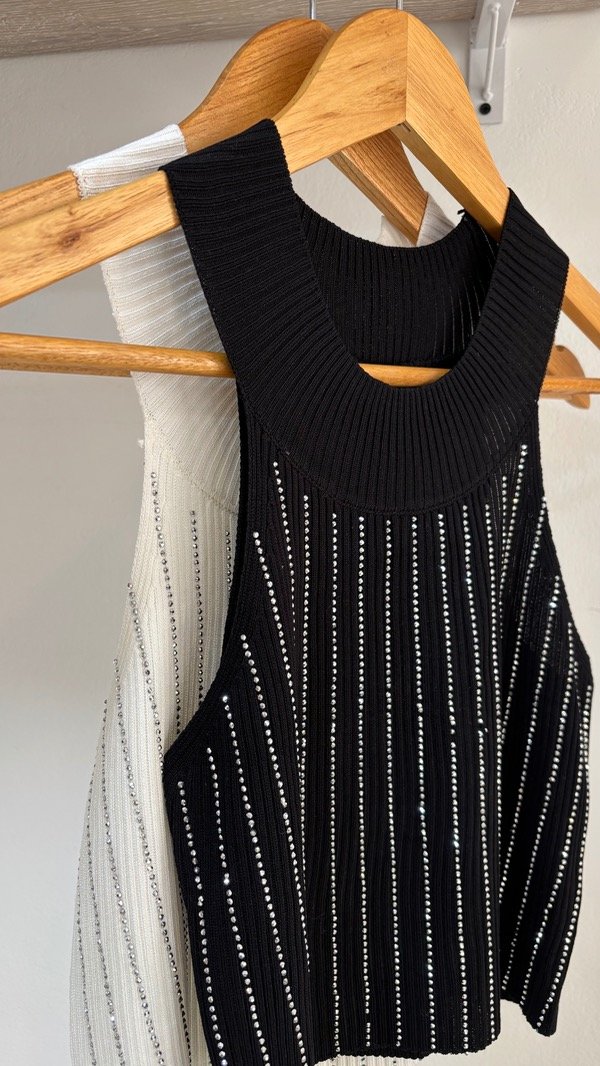 Top con cuello alto y cerrado, un corte muy fino. Elastizado & detalle de brillos en el frente