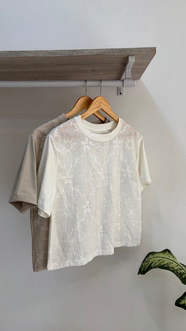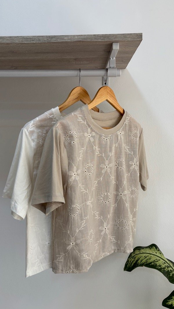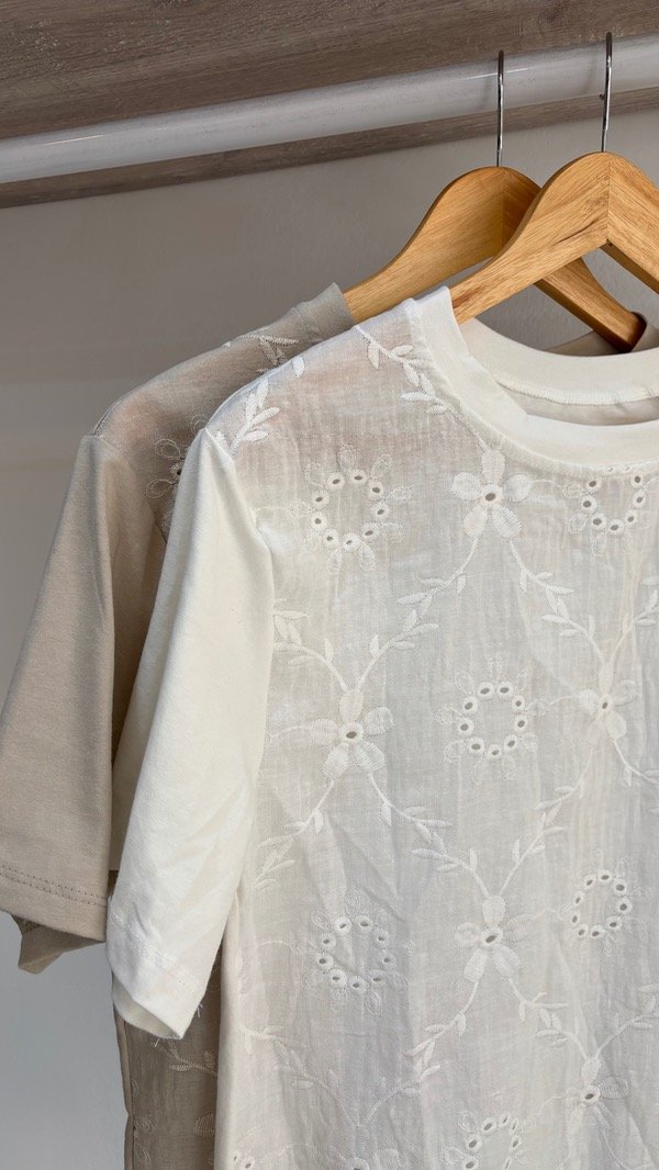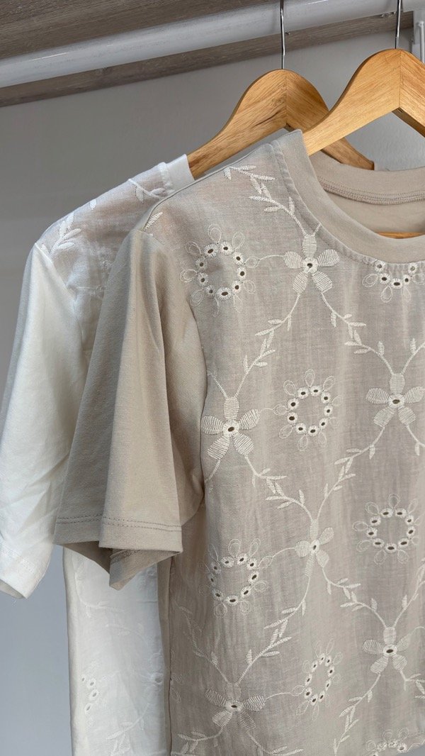 Remera trabajada con bordado en la parte de delante, espalda y magas elastizadas